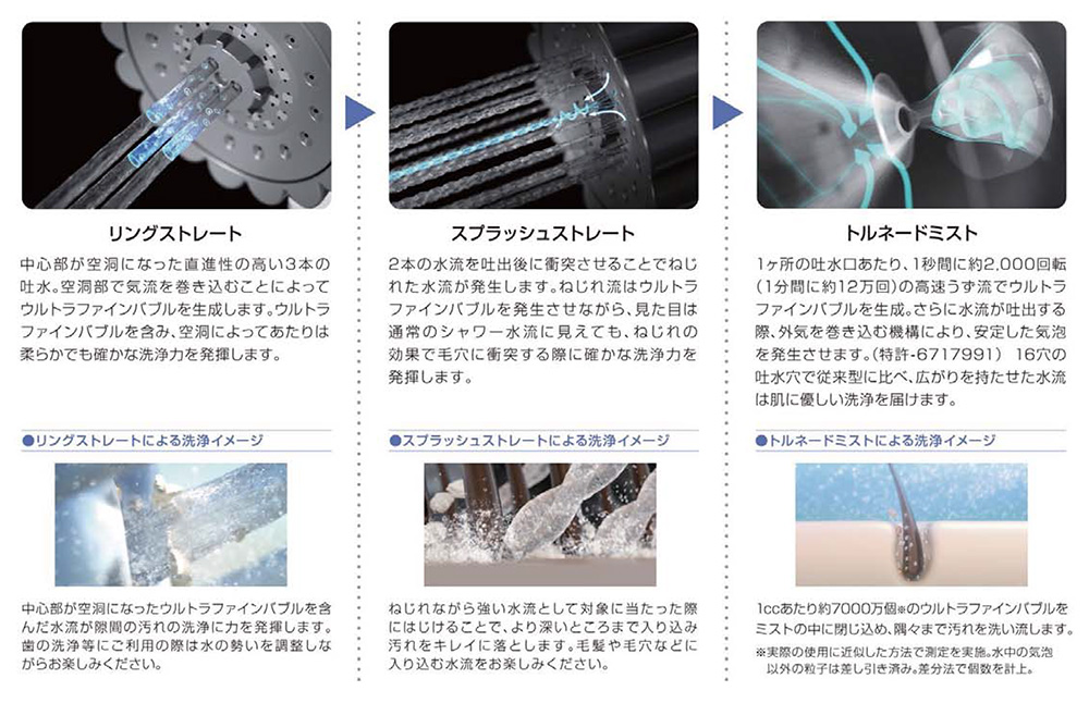 シャワーじゃないシャワー「ミラブルzero」はウルトラファインバブル ※1(超微細な気泡)を効果的に利用する、これまでになかった全く新しいコンセプトのシャワーヘッドです。ウルトラファインバブルを含んだ3つの水流で、味わったことのない洗浄実感をお楽しみいただけます。