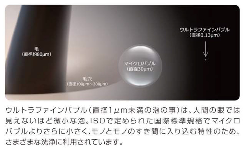 ※1:ウルトラファインバブルとは、1μm(0.001mm)未満の泡の事(ISOで定められた国際標準規格)で、マイクロバブルよりさらに小さく、非常にすぐれた洗浄力を持っています。