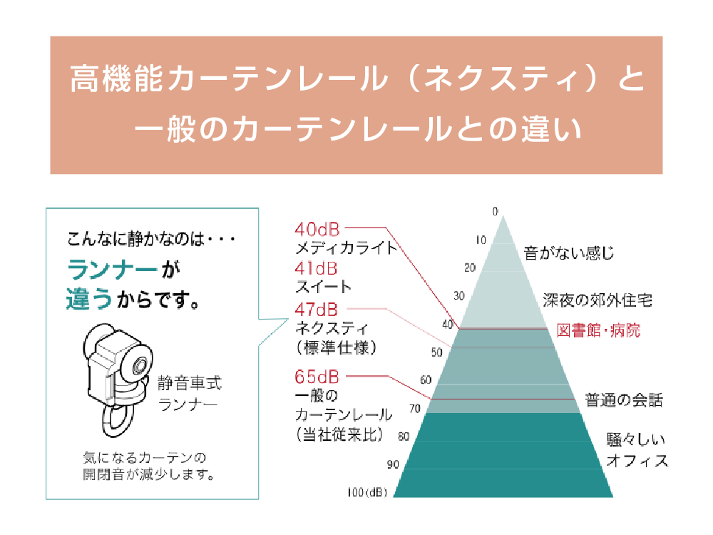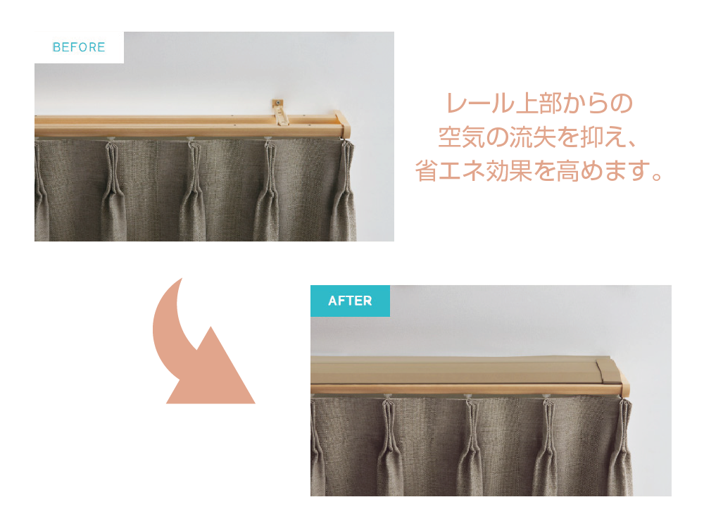 レール上部からの空気の流出を抑えることで、遮光に役立ちます。さらに、夏の熱気や冬の冷気の侵入も和らげ、毎日を快適に過ごせます。
